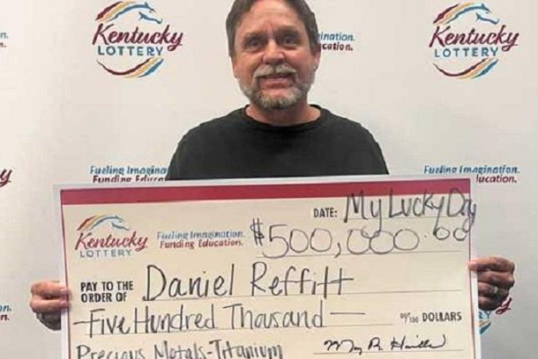 Daniel Refitt won a $500,000 prize from a Kentucky Lottery scratch-off ticket and celebrated by handing out $100 each to some nearby store employees. Photo courtesy of the Kentucky Lottery