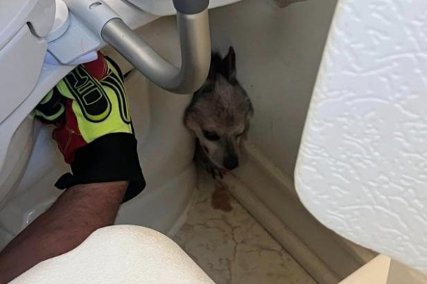 The Woodlands fire department in Texas was called to a home where a small dog went exploring in the bathroom and ended up wedged behind the toilet.