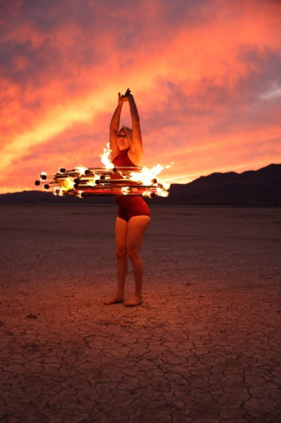 “I started with hula hoops and became obsessed with adding more and more. Eventually, I was introduced to performing with fire and aerial acrobatics and the rest is history,” she said.