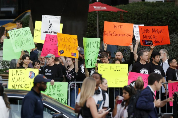 1 of 5 | SAG-AFTRA strikers hold up signs as guests arrive at the New York City Ballet’s 2023 Fall Gala at the David H. Koch Theatre at Lincoln Center on October 5 in New York City. File Photo by John Angelillo/UPI | License Photo