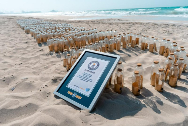 An island in the United Arab Emirates broke a Guinness World Record with a display of 1,100 messages in bottles.